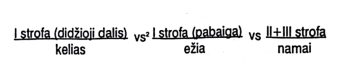 Diskursyvinėje erdvės plotinėje „kelio“ figūrai (vaizdiniui), plėtojamai I strofoje, priešpriešinami „namai“, dominuojantys II ir III strofoje. Perėjimą iš vienos į kitą erdvę I strofos pabaigoje žymi „ežia“, susijusi ir su „keliu“, ir su „namais“, į kuriuos grįžta mergina. Preliminariai tekstą galėtume skaidyti šitaip:
